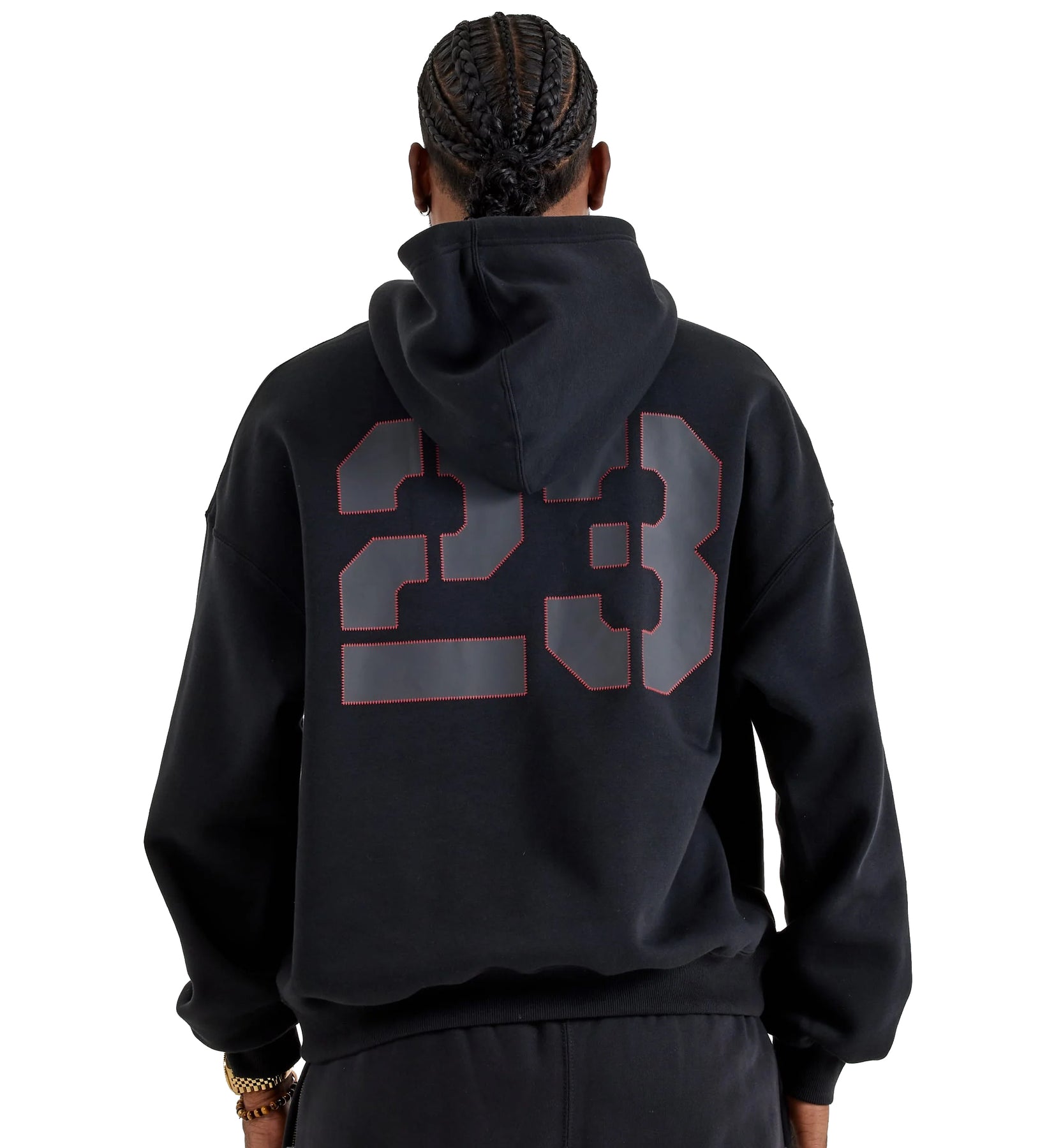 Person wearing a black Jordan Brooklyn Oversized Pullover Fleece hoodie with '23' printed on the back against a white background