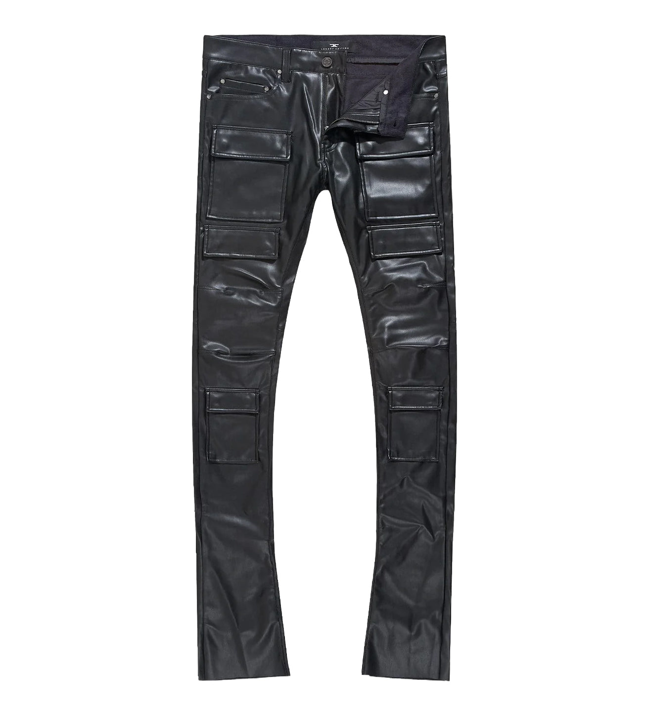 Skinny Stacked Fit – Thriller Cargo Pants — Black deliver a bold stacked look with an extended flare designed for maximum stacks. Built in the Ross Stacked Collection, this pair features a regular rise, skinny fit, and soft vegan leather construction. Multiple snap-closure cargo pockets add utility, while deep front pocket bags keep essentials secure.