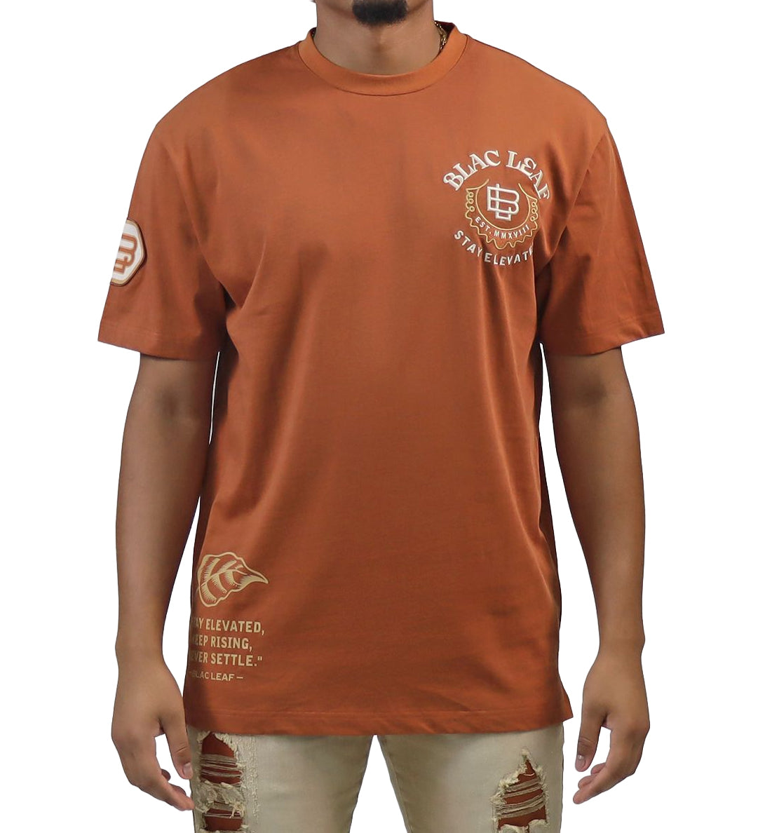Stay Elevated T-Shirt — Rust delivers bold Blac Leaf energy with a full-rust design and standout logo artwork. The back features a large BL emblem paired with the uplifting “Stay Elevated” message, while the front showcases a smaller embroidered BL logo for a clean, balanced look. Soft, comfortable, and easy to wear, this tee blends casual style with motivational flair for everyday elevation.