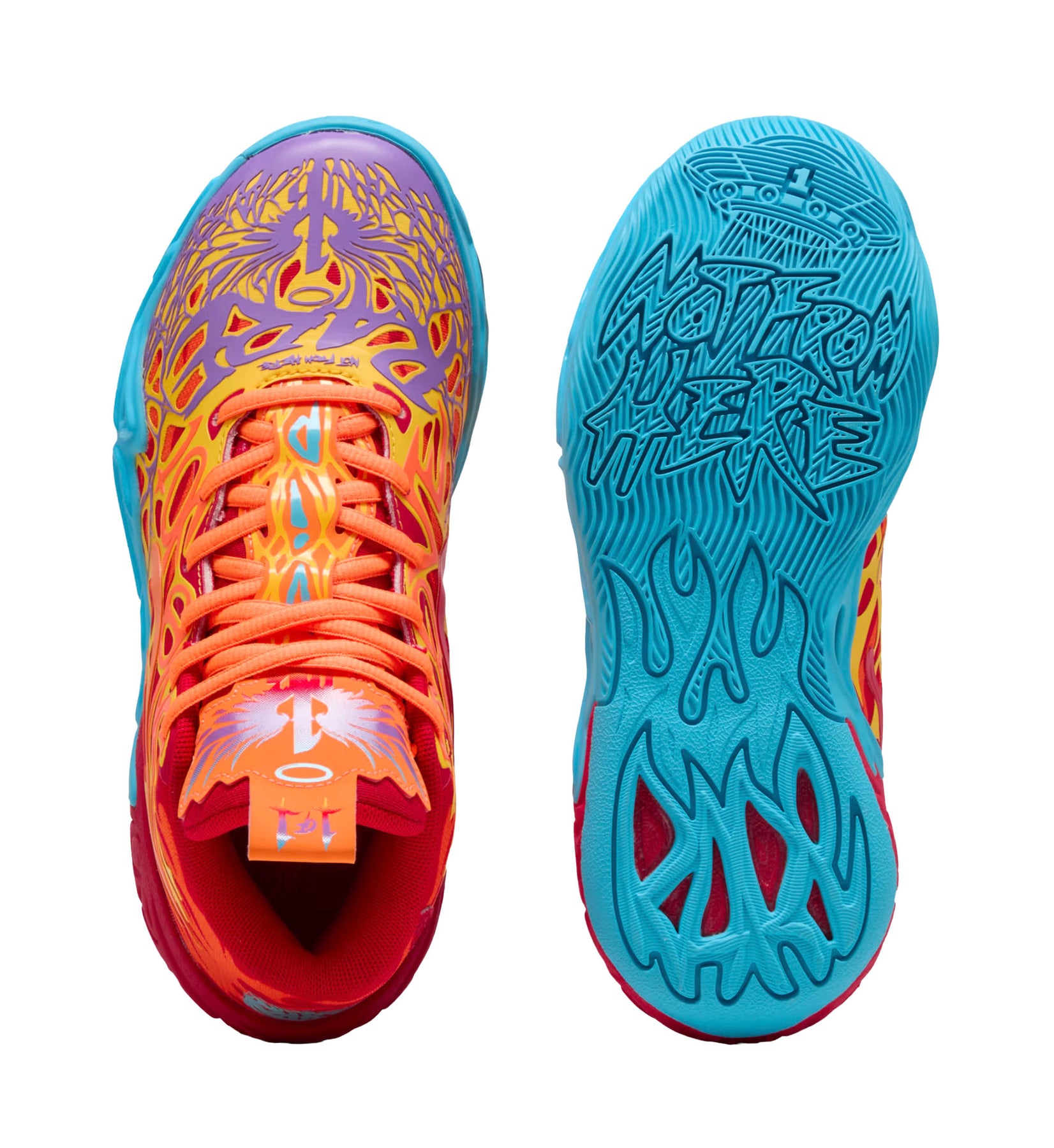 PUMA MB.04 GS “The Phoenix” — PUMA Red/Orange Glow/Fluro Orange/Purple Glimmer channels the BE MELO storyline with a design meant to transform young hoopers into Melo on the court. A unique knit upper wraps the foot with breathable support, while raised 5D printed elements create a sculpted, flame-like texture from toe to heel. This colorway embodies the mythical Phoenix from Melo’s universe—fiery reds, oranges, and yellows balanced with cool blue and purple accents for a powerful, rising-from-the-flame aesthetic.
