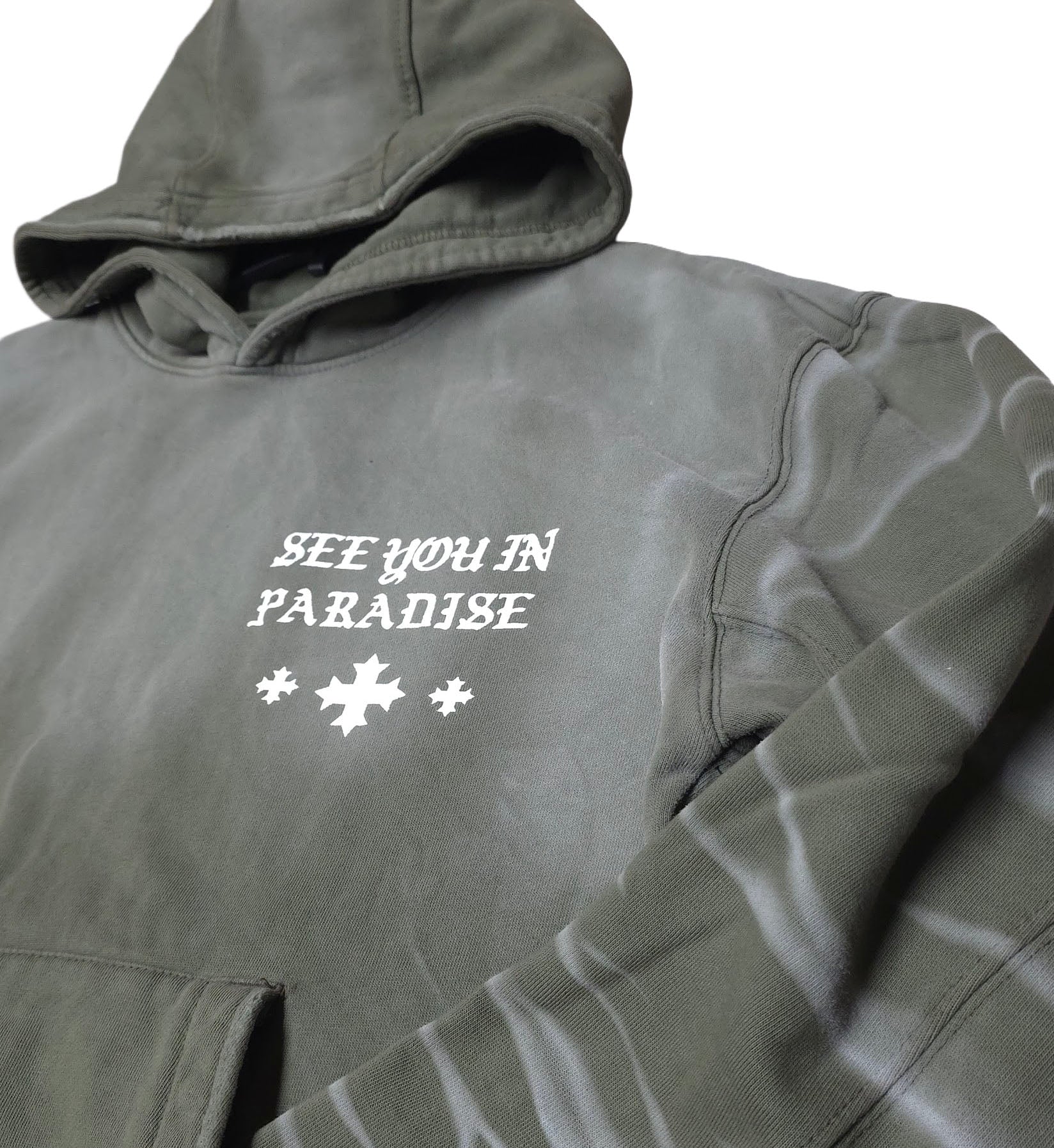 SYIP Airbrush Wash Hoodie — Olive features a soft fleece build with a washed airbrush-style fade and a gothic front print. The relaxed silhouette makes it an easy everyday layer, with a washed finish that adds character. This hoodie pairs with the matching Airbrush Wash Stacked Sweatpants (8865L-16).
